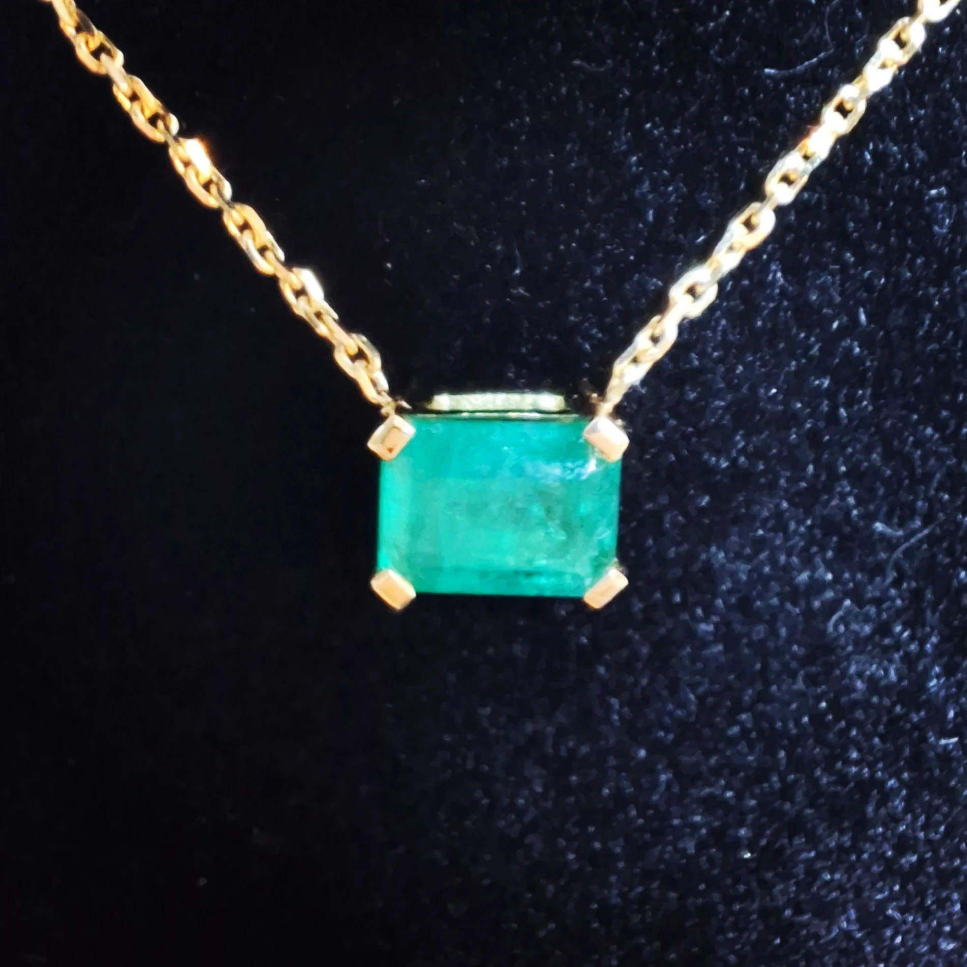 La dernière création de l’entreprise Or et Pixels, un somptueux collier émeraude en or jaune 750/1000, il a été pensé pour allier passion et symbolique. L'émeraude, connue pour son symbole d'espoir et du renouveau, est mise en valeur par un sertissage 4 griffes.