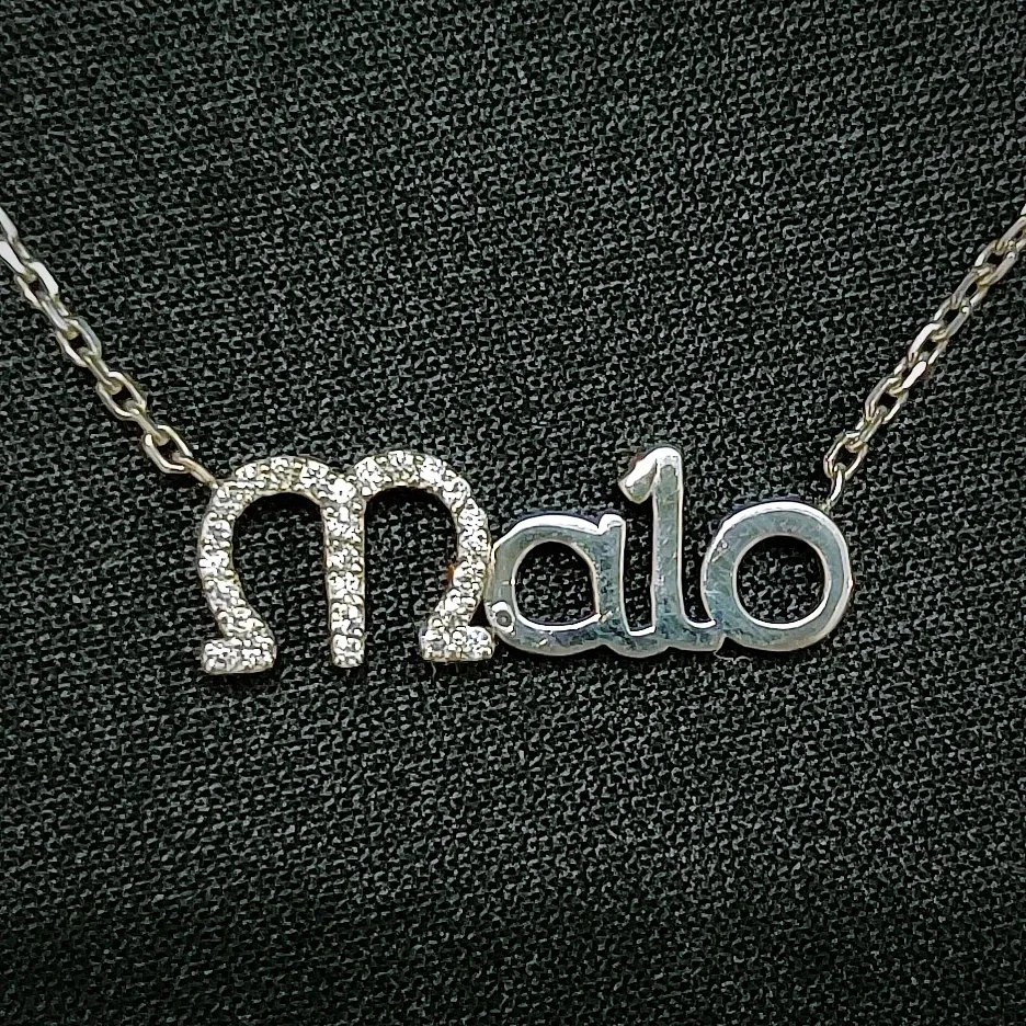 La dernière création de l’entreprise Or et Pixels, un somptueux collier prénom en or blanc 750/1000 serti de diamants naturels, a été pensée pour allier passion et éternité. Les diamants, connus pour leur symbole d'éternité, sont mis en valeur par un sertissage grains. Ils sont sertis sur la lettre M du prénom Malo.