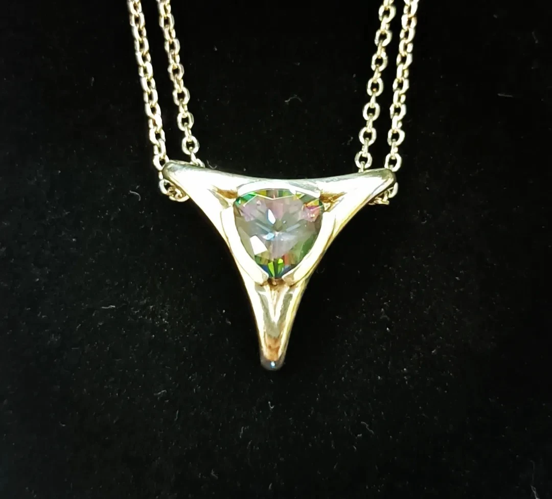Une création sur mesure : le pendentif triangulaire en argent et quartz arc-en-ciel